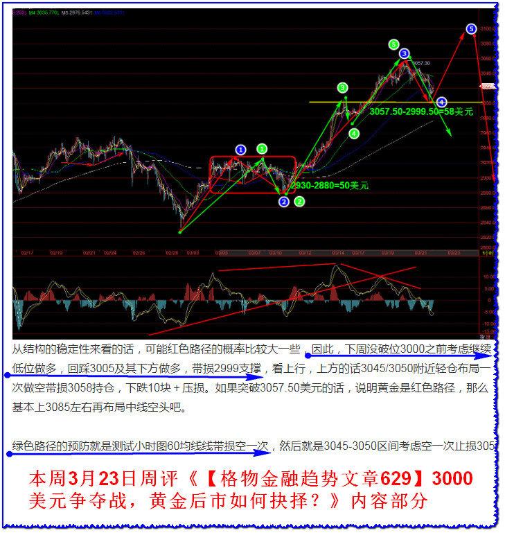 本周周评《【格物金融趋势文章629】3000美元争夺战,黄金后市如何抉择?》预防黄金红绿两种路径,首要的话就是考虑3000支撑反弹,3005及其下方守住2999.50反弹,上方预防绿色路径的话就要考虑小时图60均线空一次黄金。昨日黄金实际走势是黄金回踩到小时图60均线录得高点3033.30一路下跌到,在3005反弹了一次3015.50美元,在3002.30上涨了一次3014.50美元,基本符合预期。