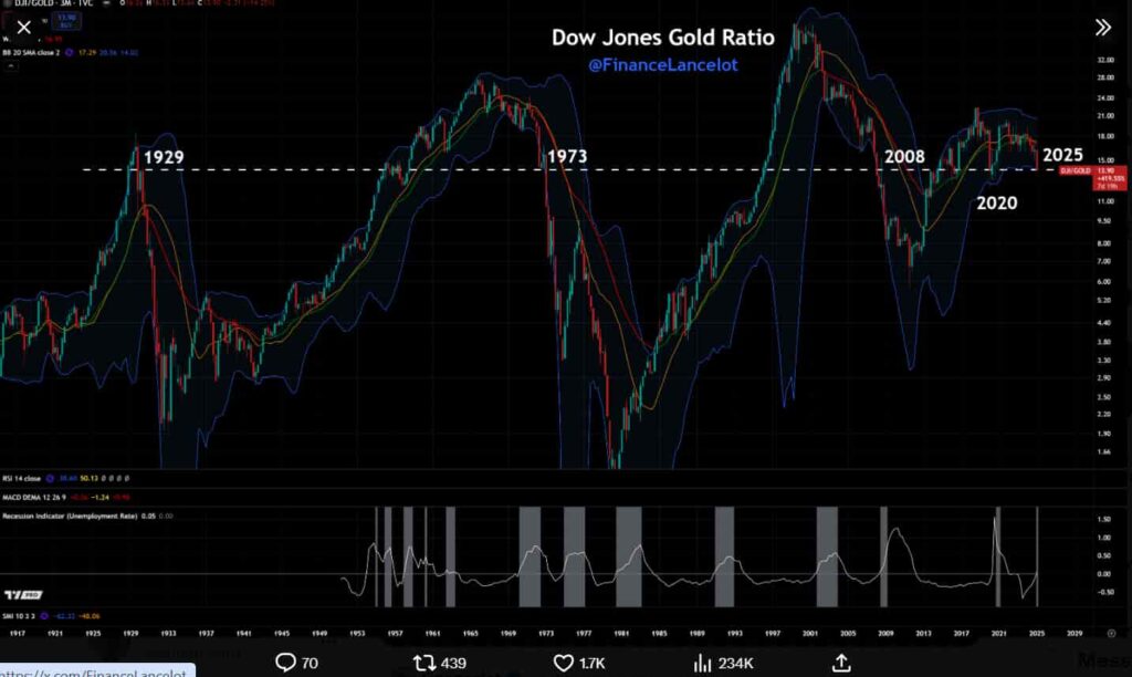 具体而言,根据FinanceLancelot在3月24日的X帖子中的展望,衡量股票与黄金相对价值的“道琼斯/黄金比率”正在接近一个关键支撑位,该水平在历史上预示着严重经济衰退的开始。