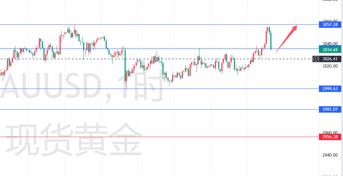 今日受消息面的刺激,全球贸易紧张局势进一步升级,市场避险情绪升温,但是美盘初请数据公布利空加上金价在触及上周历史高点后的抛盘情绪导致,金价短线下跌,截止发文报3035附近。在金价多头趋势上,秦氏金升建议是可以在3035-3030分批做多继续看好上行,防守可放在上一波起涨点3027附近,去看金价向上破位历史高点的。