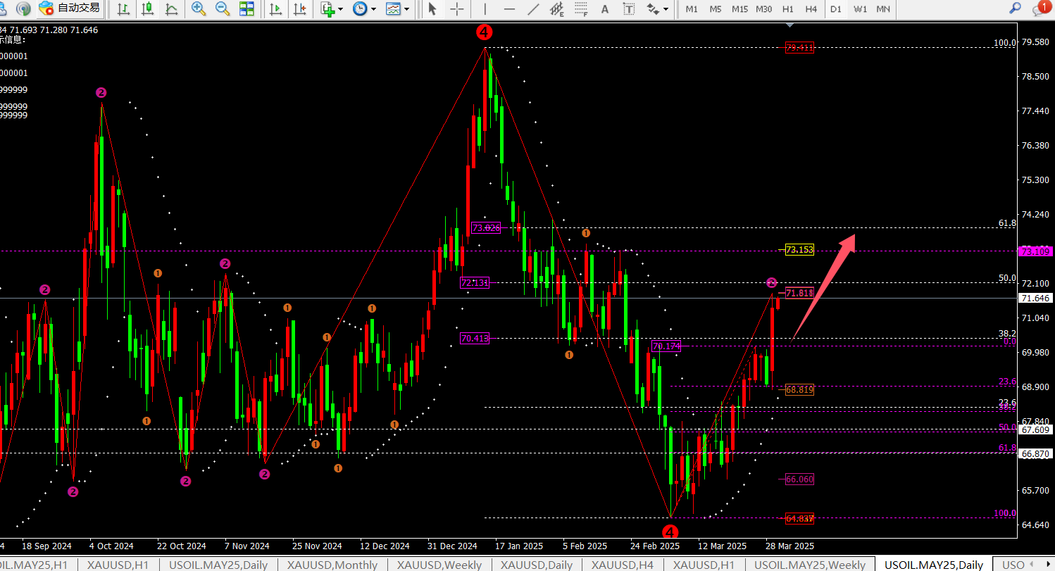 目前价格震荡上行冲击72.1或者73一线。而支撑关注点是71.2一线跌破价格会到70-70.3附近。