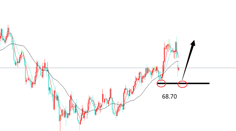 昨天的原油日线出现了连续墓碑,是72.00附近的压制打压,还有就是白银的基本面也对它有打压,今天的思路短线我们继续看反弹,关注68.70附近的支撑,这个位置上面都是多头的反弹,白盘我们先等待机会,原油它是周线趋势已经开始蠢蠢欲动,需要关注这周的收线来确定它的未来是否启动周线的趋势。