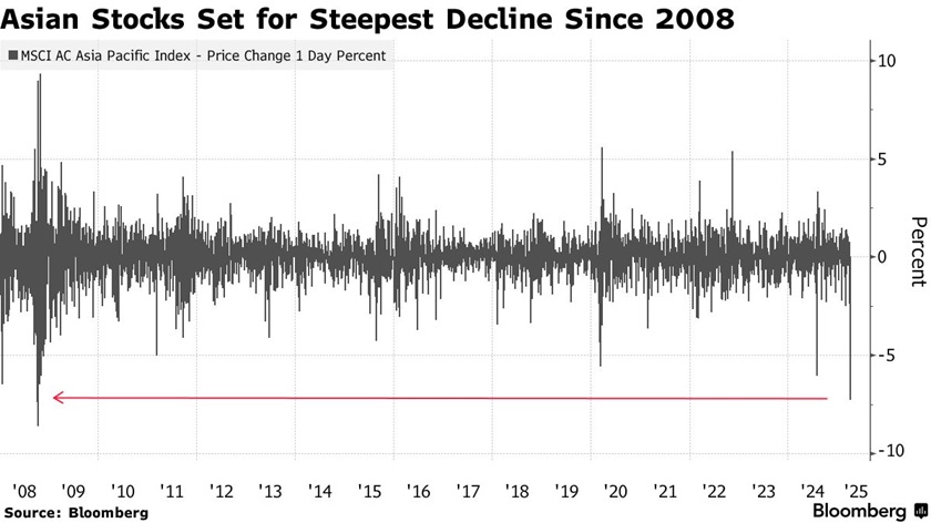 MSCI亚太指数跌幅高达7.9%,为2008年10月以来最大,其中台积电、腾讯和索尼跌幅最大。香港恒生指数暴跌逾10%,各地区股市均大幅下跌。