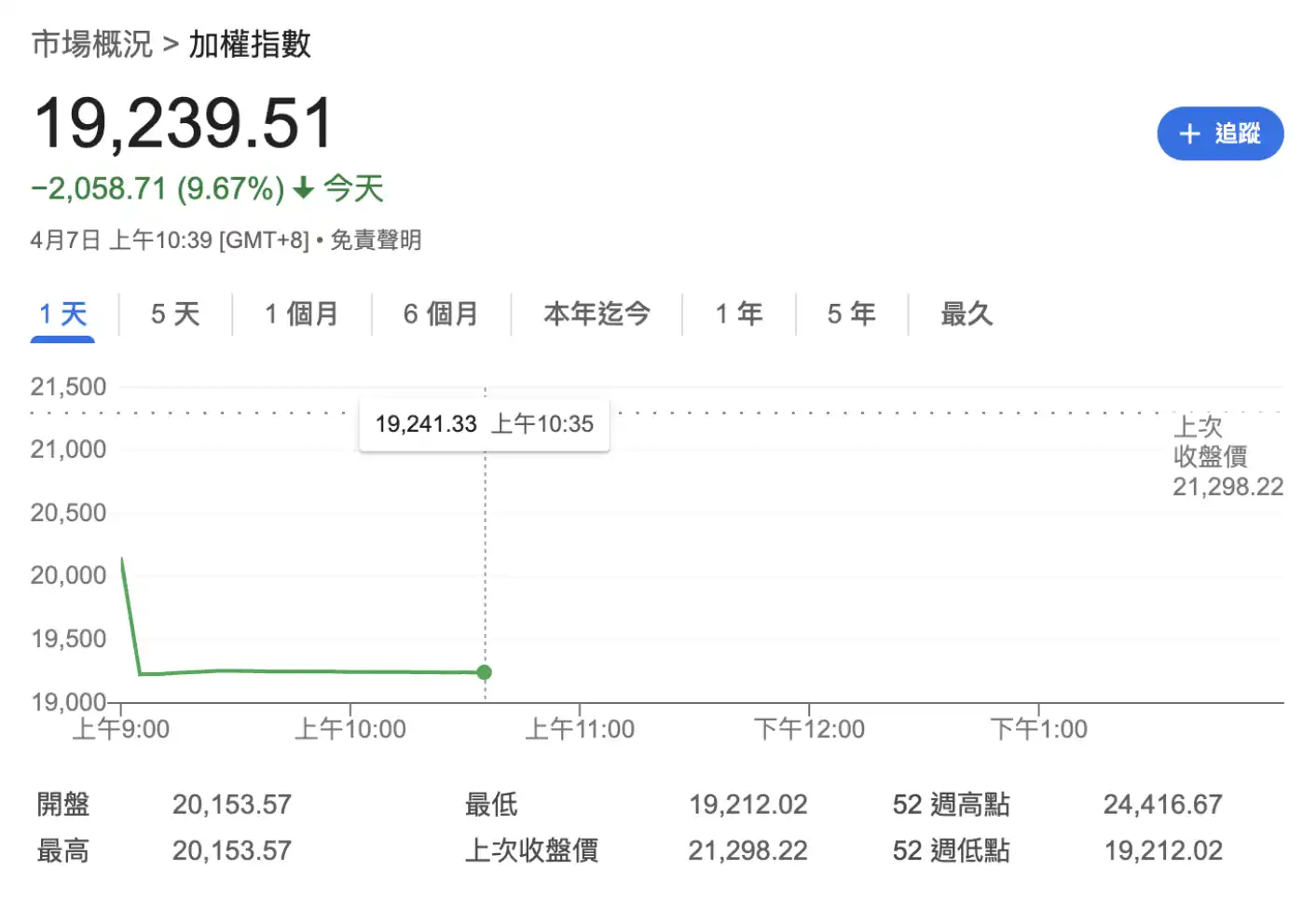 上周因连假逃过一劫的台股今日开盘也暴跌,一度下挫 2085 点,最低来到 19212 点(或 9.8%),创史上盘中最大跌幅。其他亚洲股市早盘包含日股、A 股、韩股也血洗一片,一度触发熔断机制。