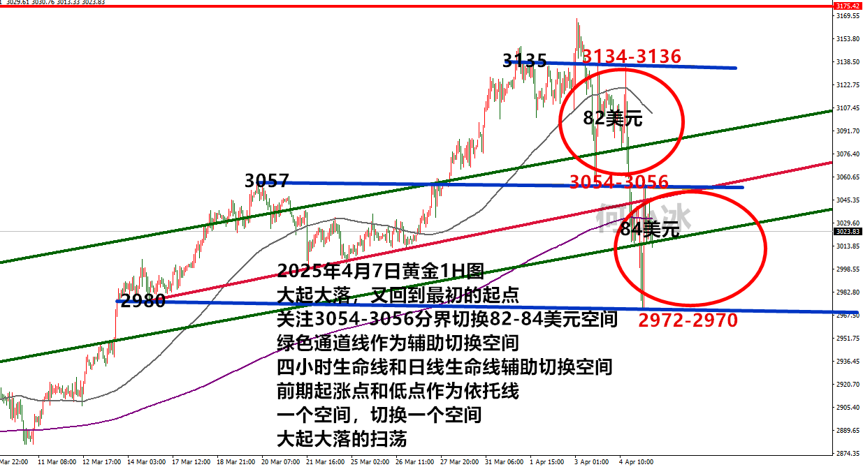 特别是这种大起大落的扫荡行情,启动即加速,修正即反转,空间幅度至少20美元,加速则是60-80美元