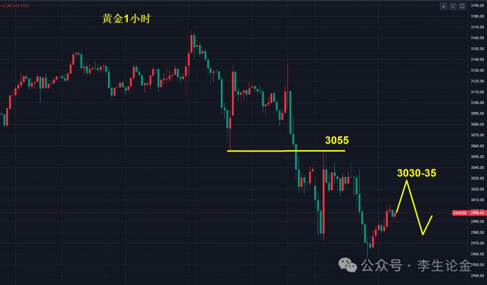 昨天,黄金我强调重点关注3055美元多空分界点,即使长期看好牛市,也不代表盲目的追高,3055美元作为顶底转换的关键位置,此位置没有被突破之前,继续高空黄金,昨晚直播也同时明显表示反弹3040-45的区域空黄金,因为前期3100美元的失守就已经为短期的调整埋下了伏笔。