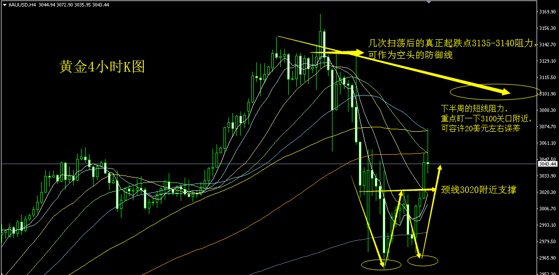 阻力的话,较强的位置是上周经历两三次强烈扫荡后真正的起跌点3135-3140美元附近,该位置可作为短期空头的防御线,等于说这个阻力位置未被突破的话,可以当做高位大区间上下扫荡或震荡回调周期看待,上破的话就不排除继续破历史新高。