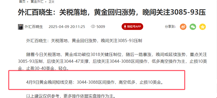 外汇百晓生:关税落地,黄金强势上涨,日内3056-3122区间操作