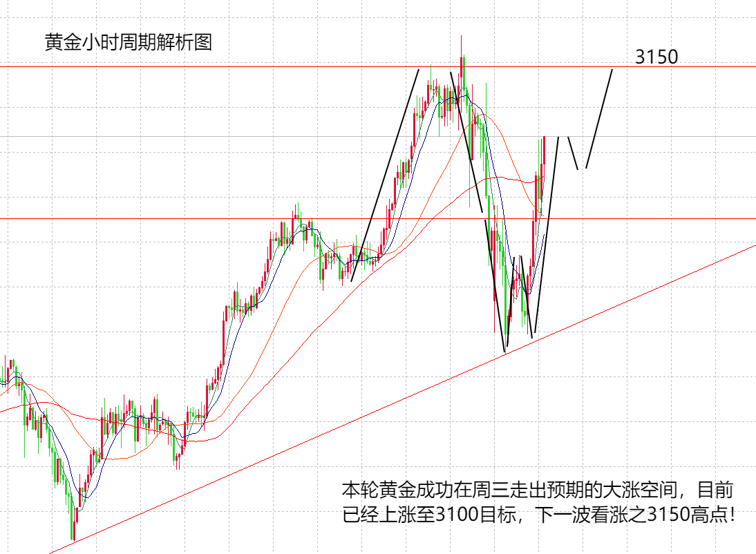 这波黄金的暴涨暴跌山海有两点可以骄傲的,第一点,在节前黄金出现暴跌的是,非常明确的提示大家,大周期的多头趋势不变,下跌算是中期调整,短线可以做高空低多,主力依旧是回落做多,并且随时准备抄底做多。第二点,在节后周一,周二一直提示低多做趋势交易等待大涨空间,并且非常准确的给出周三或走出变盘的大涨,实际行情也是预测,周三单日单边走出130美金的暴涨空间,而且实现了山海的预期3100高点。所以,这波黄金的涨跌,预测和交易都给的非常完美,这波又给大家带来了丰厚的利润。在这里很感谢大家的信任,也感谢你自己的坚持。今天的国际黄金还是在关税的影响下有较大的波动,从周三的暴涨可以看出,黄金的避险情绪再度升温,当前最高在3100,这里是上涨的第一目标点,继续上涨的话上方可以看到3150,所以上方还有较大空间,大家注意尽量顺势交易。另外,今天还有一个不确定因素,美盘将公布CPI数据,这个数据也会带来黄金的异常波动。所以,今天行情也会有较大波动,大家注意控制风险,管理好仓位。从技术面来看,日线一根顶天立地阳线直接改变了前期的极弱调整状态,现在阳线破位布林中轨,拉高均线放量,那么,黄金就进入了多头趋势的极强状态,在此状态下要继续上涨至前期高点3150,所以,今天主方向肯定是看涨。小周期在3100压制下走出调整属于正常走势,现在的H4周期布林刚刚开口,单边走势才走出第一波力度,下一波再涨到日线周期高点问题不大,所以,H4周期只要回落到单边均线支撑上就是做多的机会,下方支撑在3070附近,而小时线周期的上涨则放在3060附近,所以,今天黄金看涨预计考虑在3070或者3060两个点位,亚欧盘上涨还是看3100,美盘突破3100则考虑看到3150高点。当然,多头趋势看涨不猜顶,顺势才是王道。