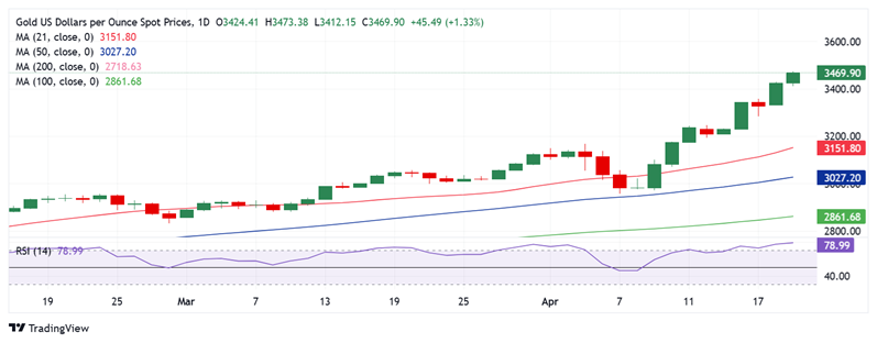24K99讯 周二(4月22日)亚市尾盘,现货黄金延续日内强劲涨势,金价刚刚触及3498.52美元/盎司,创下历史新高,金价日内暴涨逾70美元。FXStreet高级分析师Dhwani Mehta撰文,对金价技术走势进行分析。
