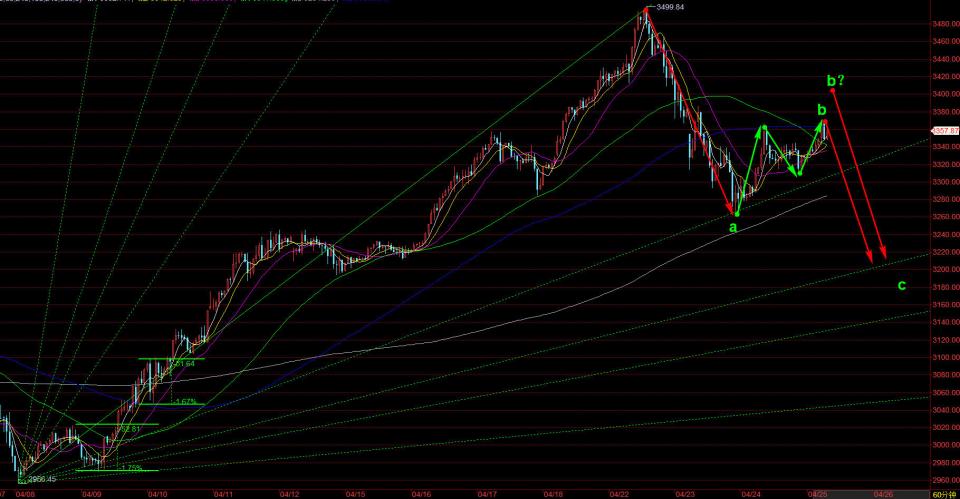 现在我们继续看图,基本还是4月13日模式图,3260结束了一阶段下跌形成a浪,3260的反弹是b浪走势,昨天文章提到是一个之字形折返走势,今天早上开盘启动早,行情一定突破了一次昨天高点3367.50,后面两种情况,一种情况就是3370反弹到位继续下跌,如果突破的话那就是3410/3420再考虑空头,下方的话短线3330不破考虑反弹,进一步就是3305的支撑不破上行。如果跌破3305,那么黄金就要再探底或者新底测试3220甚至3167的平台,也就是c下跌。