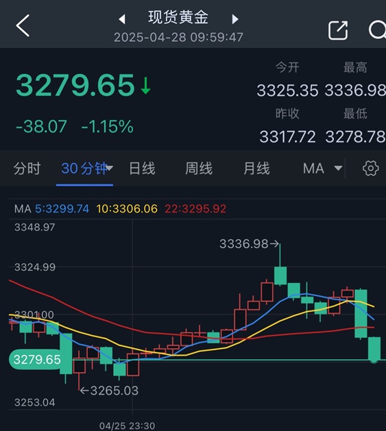 24K99讯 周一(4月28日)亚市盘中,现货黄金突然加速下滑,金价目前位于3280美元/盎司附近,日内暴跌38美元。金价已经远离盘初触及的日内高点3336.98美元/盎司。