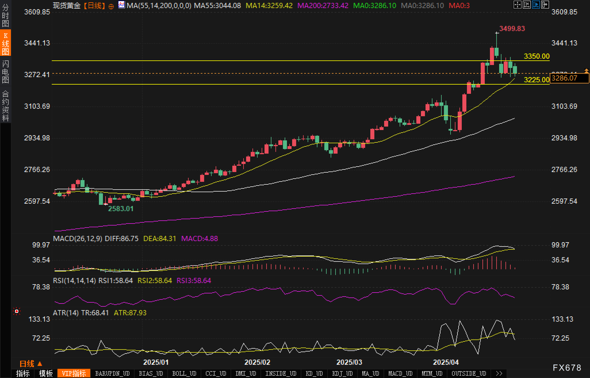 指标显示MACD值为4.88,表明中期动能仍偏向多头。RSI指标处于58.64,位于中性区域,没有明显超买超卖信号。ATR指标显示市场波动率保持在较高水平,当前读数为87.93。