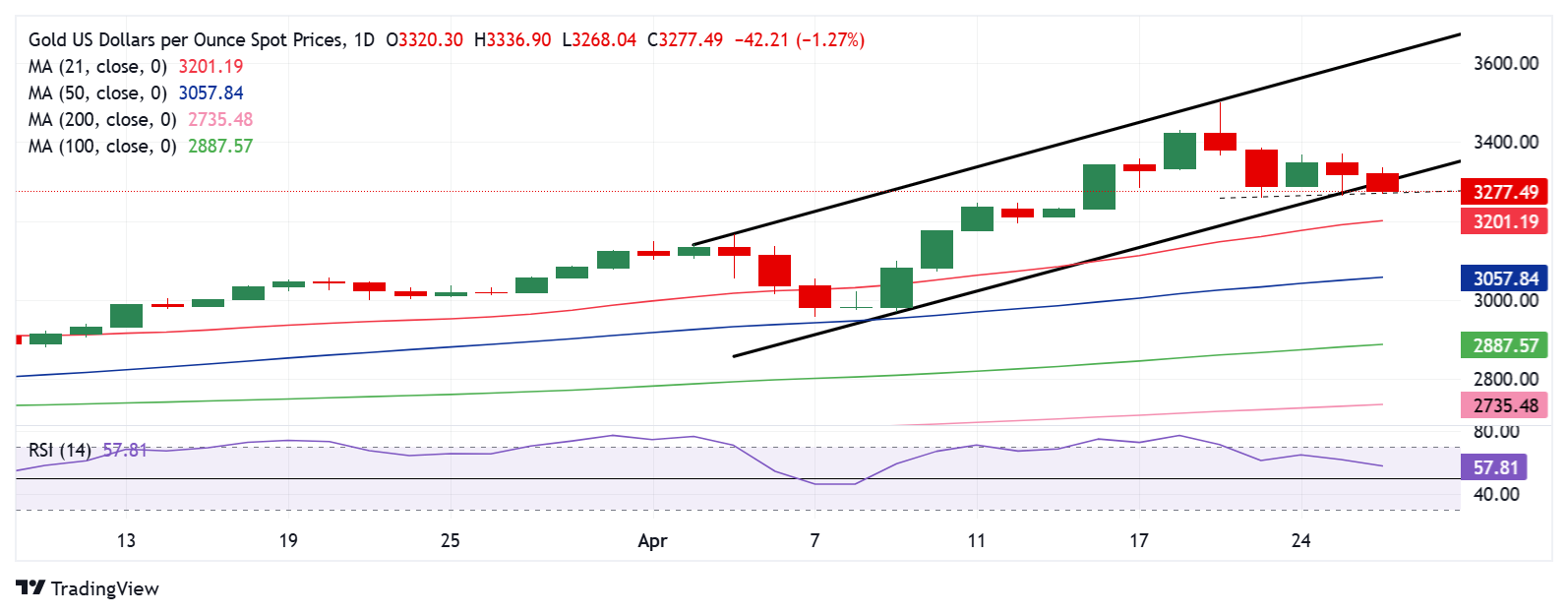 技术面来看,黄金价格创纪录的上涨和随后的调整似乎正在测试三周以来持续的上升通道的下行区间。14日相对强弱指数(RSI)指向下行,目前接近58,支持近期的下跌。然而,该指标仍维持在中线之上,表明在关键的3,260支撑位附近可能会出现逢低买入的机会(即上周低点)。