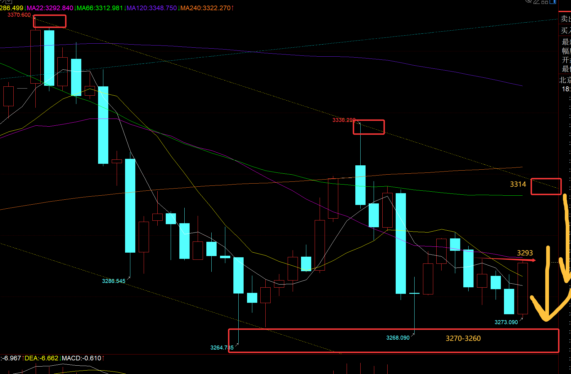 第四,黄金小时线级别:亚盘从3336跳水跌至3268,欧盘从3300震荡一路慢跌至3273,整体亚欧盘的走势偏下行偏弱,那么今晚仍倾向于压制看跌;只是低点也在小碎步慢上移,从3260到3264到3268再到3273;这样可能就存在震荡反复扫盘,慢跌好端端的,突然急拉; 拉升好端端的,突然急跌;先关注中轨3293下,也是欧盘的一处开跌口,若向上突破,则关注3314,大阴开跌口,也是黄色通道的上轨承压点,触及逢高看跌回落,等什么时候有效失守3270-3260,则会试探下一个支撑3245、3228等;