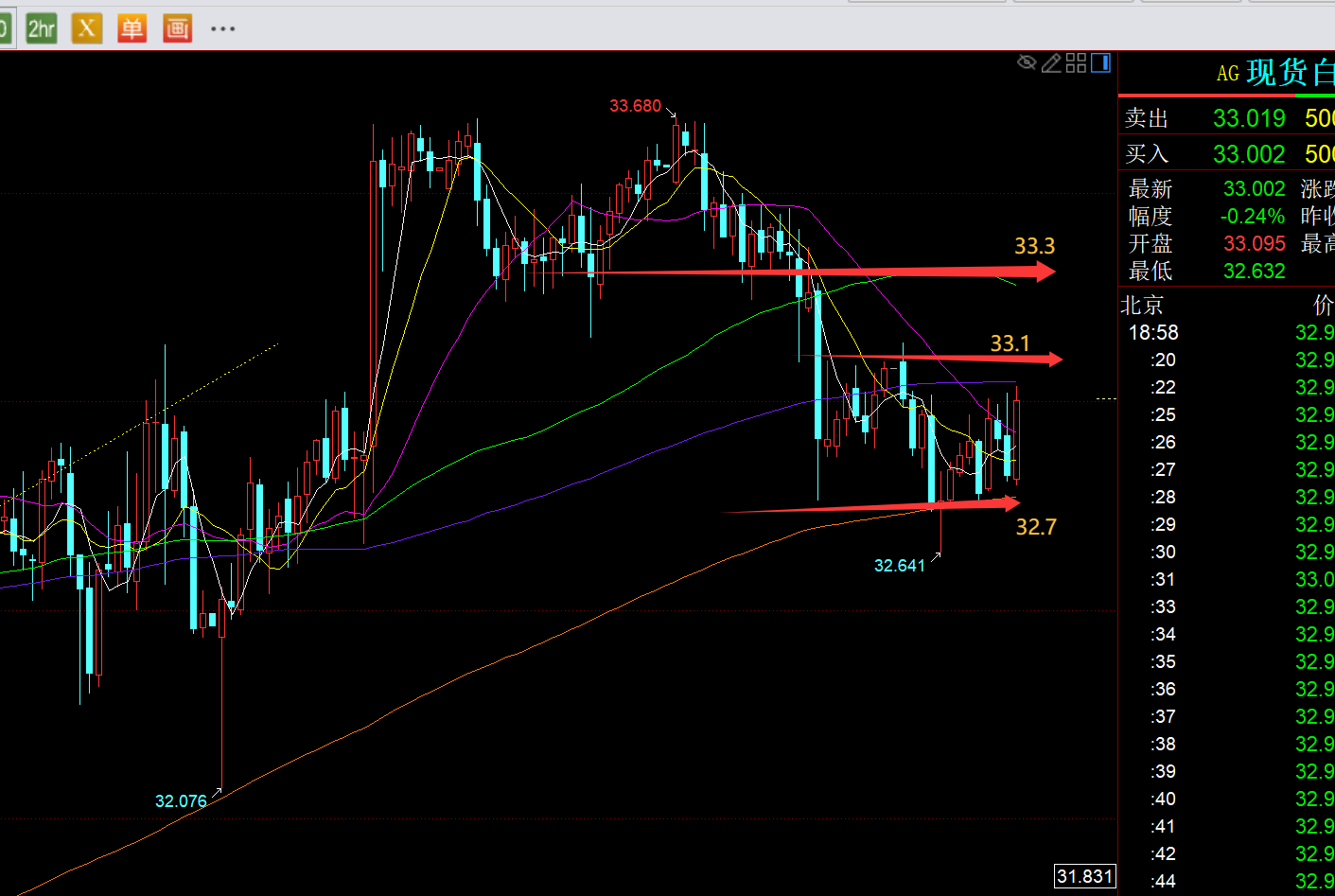 第二,白银方面:它整体仍抗跌于黄金,32.7上还是撑住了,由于这几日和黄金不太同步,也就多选择看戏;