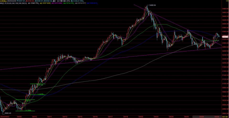后续的话还是个可上可下的走势,3260不破就有望继续上行,破位才能打开下行空间,目前的话就关注3353的高点了,不破行情回撤,下方的话回踩小时图60均线考虑做多一次,然后就是3290支撑了。上方如果突破昨天的高点的话,大概率3370可能要被突破,那样的回踩找机会再继续低多,然后到3410/3420再看回落。然后后续两种走势,一种是创历史新高,另一种就是3500关口的下跌做一个更复杂的复合abc调整,也就是说后面一段黄金多空可能都提升了难度,风控务必要跟得上。