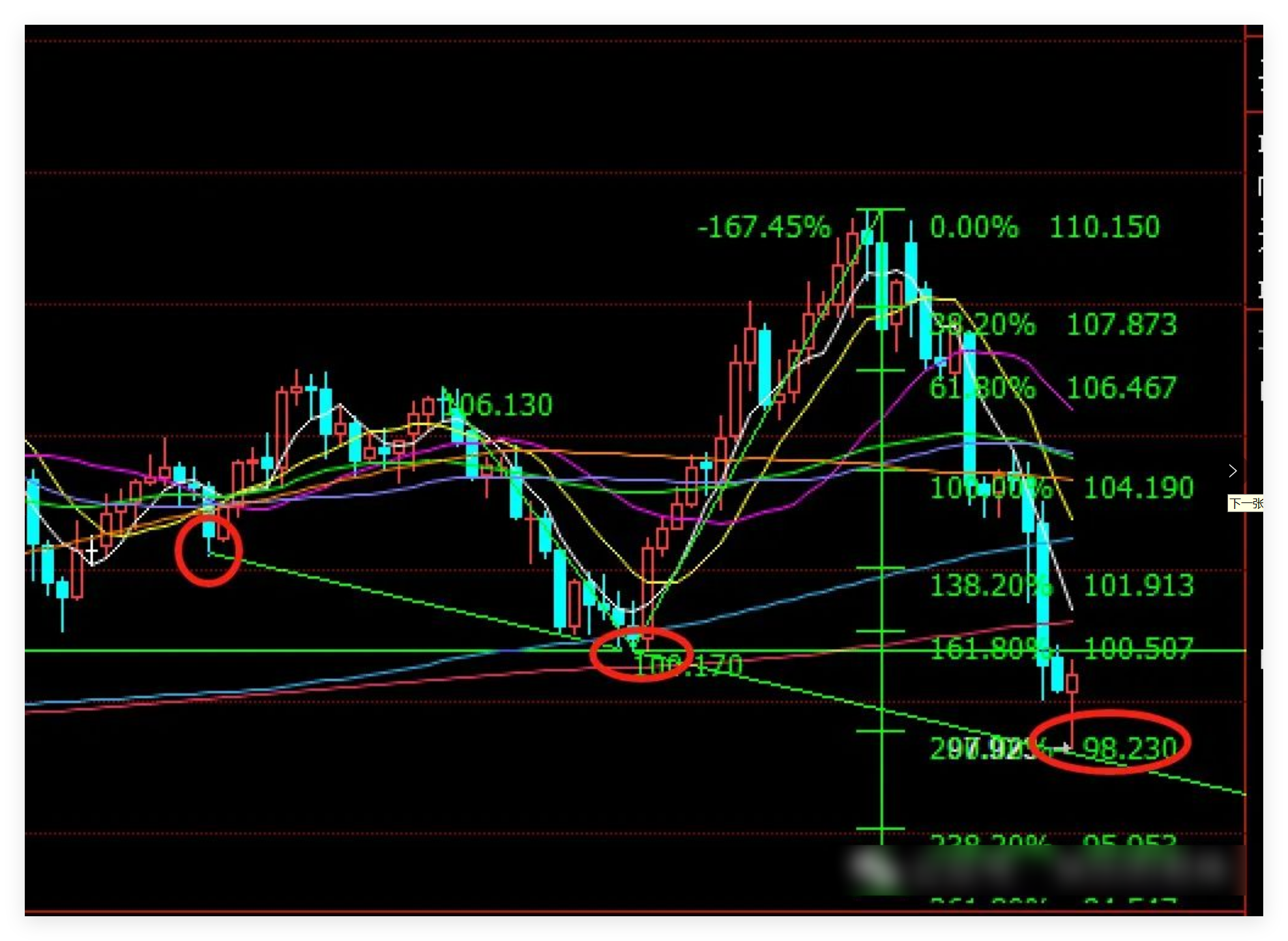 美元指数,本周美元下破100大关后最低98下方,触及0.618位置及周线反趋势支撑后如预期超跌反弹,周线收取下影小阳线!
