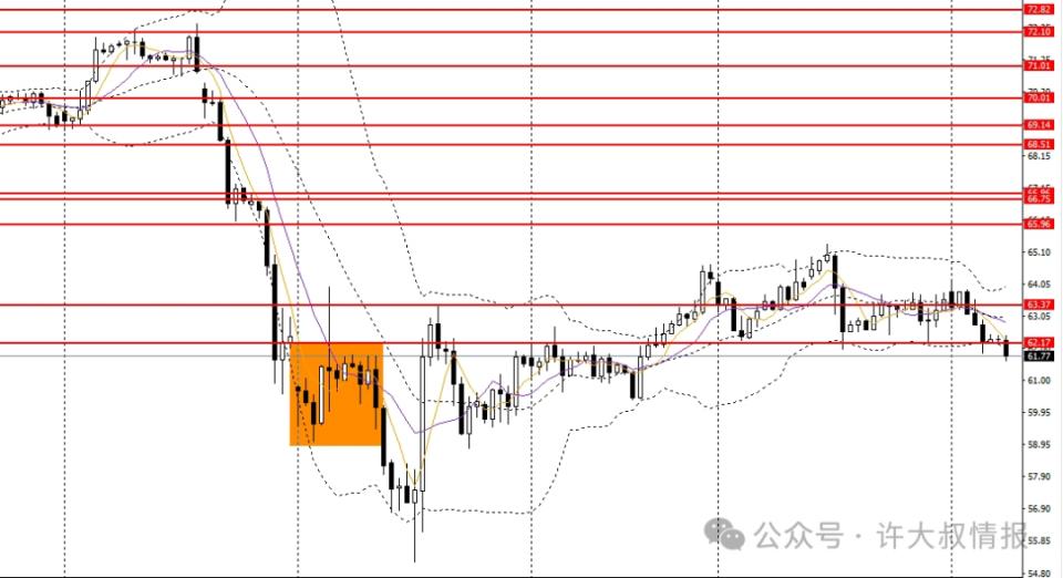美原油大幅跳水,下破10日均线,日线RSI拐头下行,4小时失守62一线支撑,呈头肩顶,63下方可延续高空思路,下方首先关注60附近支撑。