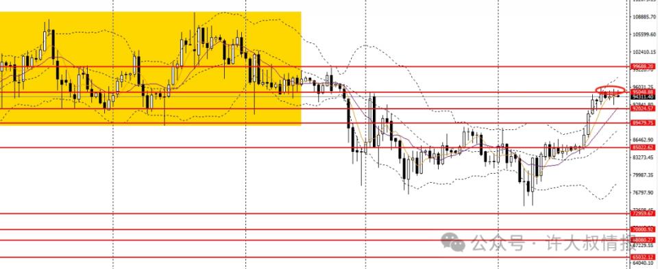 比特币再收十字阳线,多次触及95000一线阻力,日线RSI仍位于高位,如彻底站上95000,可看多至100000,无法升破,短线或回踩92000附近。