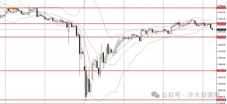A50收小十字星,4小时呈头肩顶,13200为上方第一压力,多头力量减弱,短线多单建议离场,短线不排除将重新下探13000关口。