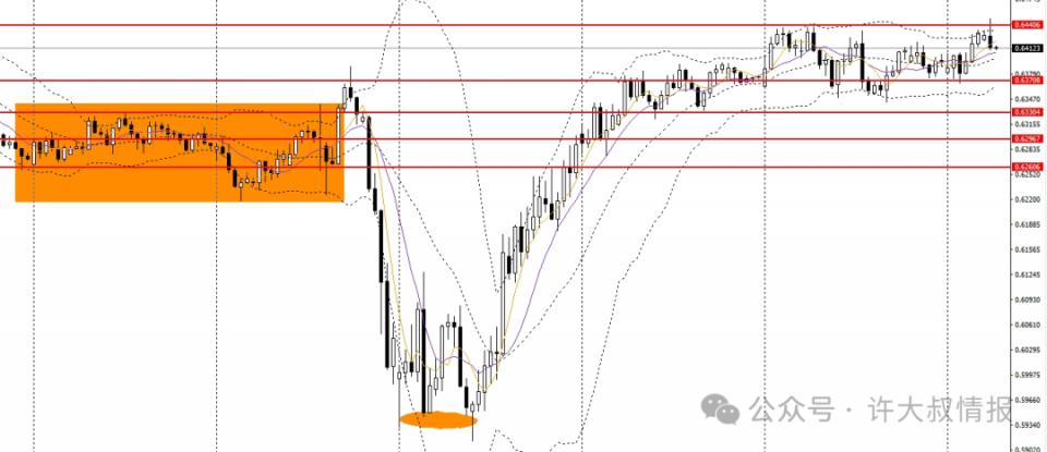 澳美刺破前高,仍立于5日均线,4小时未能有效升破0.6440一线阻力,如继续承压下方,多单可暂时离场。