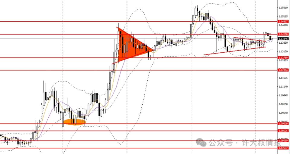 欧美日线呈多方炮,5日、10日均线交错,4小时升破三角整理区间,1.14附近仍面临强压,如无法正式升破,多单可暂时离场。