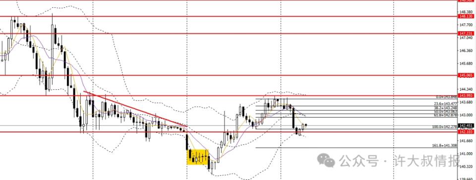 美日深度跳水,日线RSI仍位于50下方,4小时刺破142关口支撑,且未能升破143附近压力,短线趋势转弱,如彻底跌破142,后市有望重新回踩141.3附近。