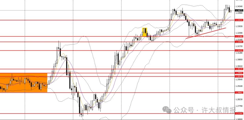 镑美升破前高,站上5日均线,日线RSI到达高位,4小时多头动能减弱,多单可减仓,稳健者可保持观望,如回踩1.3340-60一带企稳可进多。