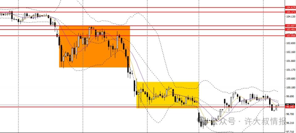 美元指数收看跌吞没阴柱,失守5日、10日均线,日线RSI仍位于50低位,4小时跌破震荡区间下沿99,如彻底下破99,短线大概率将再度下探98。