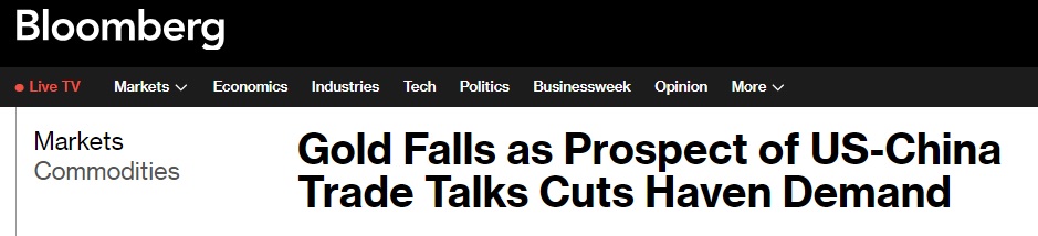美国彭博社周四报道称,金价连续第三天下跌,因有迹象表明美中之间的贸易谈判可能取得进展,抑制对避险资产的需求。中国中央电视台表示,美国一直在通过各种渠道与中方联系。