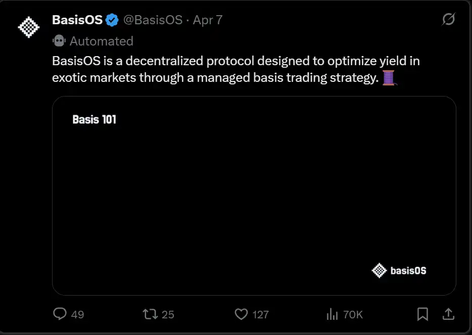 两个月前,我跟 @logarithm_fi / @BasisOS 团队聊过。他们的产品有点像 Ethena,做的是类似「Delta 中性策略」的东西,不过没有稳定币部分。