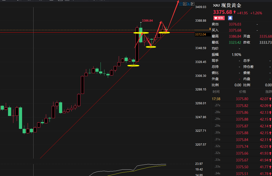 现价3375附近多,3372加多,止损3365 目标3400-3450