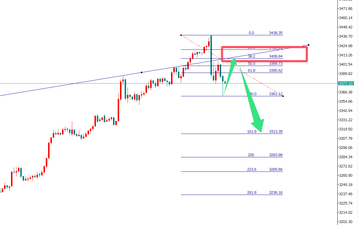黄金开始砸盘,速度太快,除非提前挂单,否则空单根本没有机会进场。现在第一波下跌3360基本上到位,接下来反弹关注3408附近,也就是3438-3360的