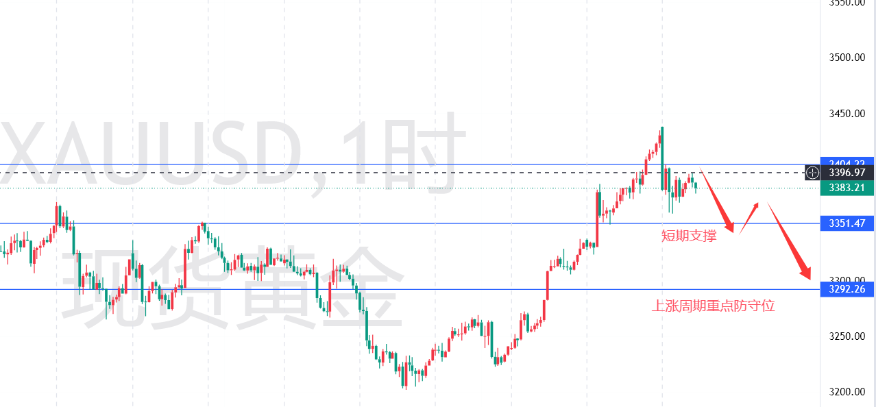 黄金自3500顶部回调以来,在3200算是一波走完,因为本周上涨破位3386这里,反弹突破618关键位置,现在我们需要分析自3200这波上涨的趋势,也就是今日早盘的高点是否是尽头。既然要分析这波上涨,那么后市是需要关注早盘这波跳水的延续度,早盘虽然在3360止跌反弹,但是多头的动能不足。这点从小时级别可以看出,今日开盘跳水后第一波反弹高点在3404位置,后面的反弹都没有越过此位置,现在欧盘开盘,短线先关注此位置阻力压制情况。