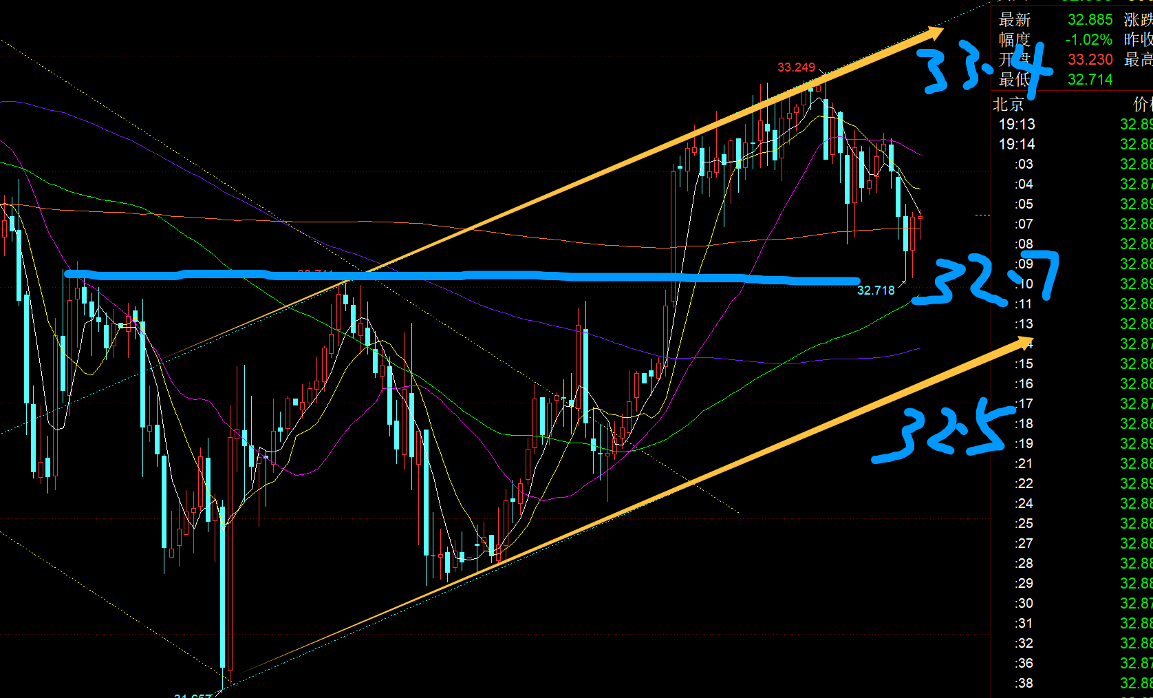 第二,白银方面:昨日等待32.7顶底位置,并未给到机会;