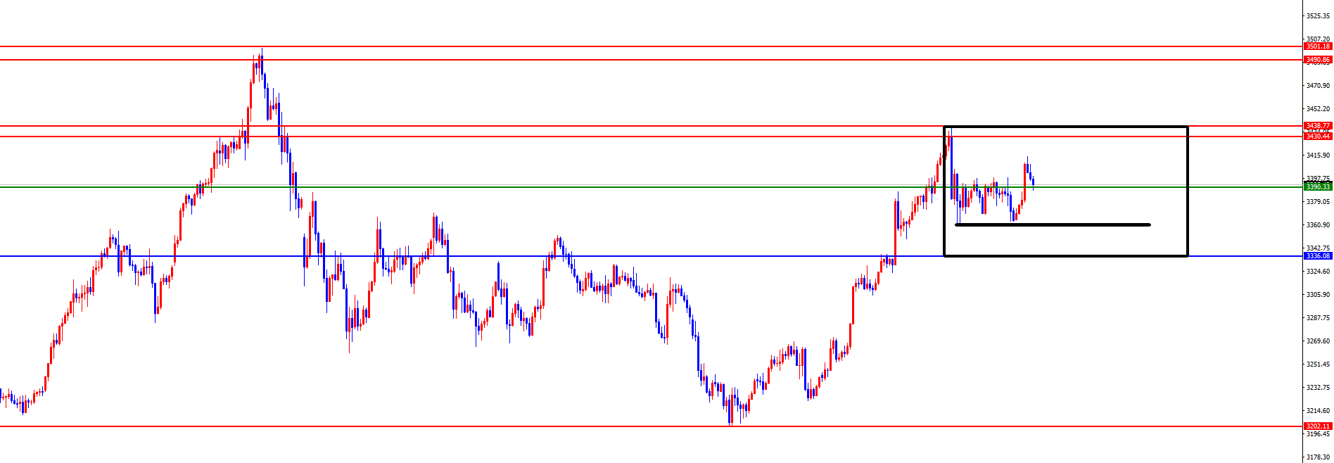 黄金暂时关注3337-3434.7区间震荡,中间分水岭于3389