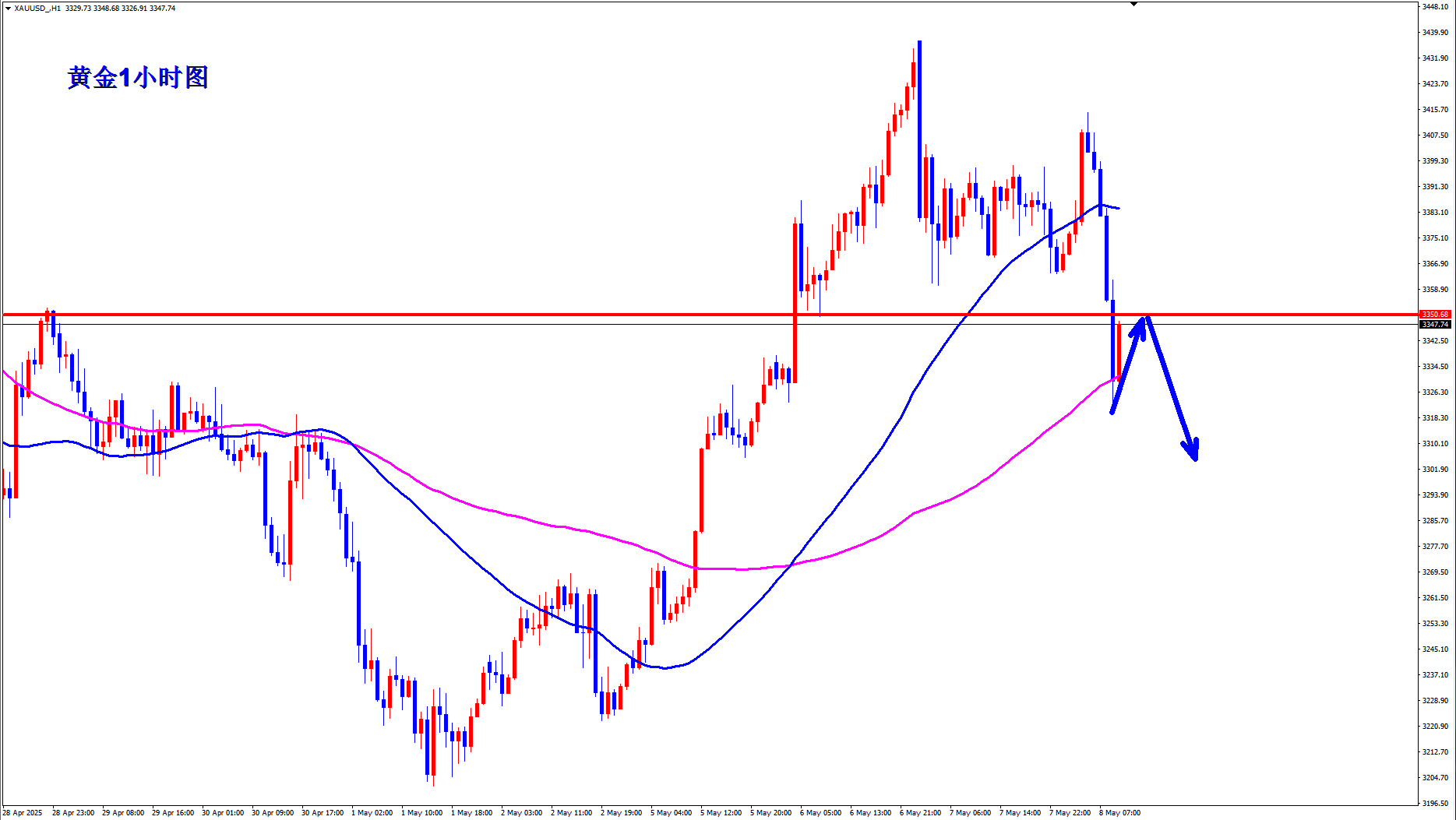 黄金1小时均线高位也开始拐头,黄金多头力度受到了打击,黄金午后反弹承压3350就是空,黄金反弹现价3347附近可以先空起来。