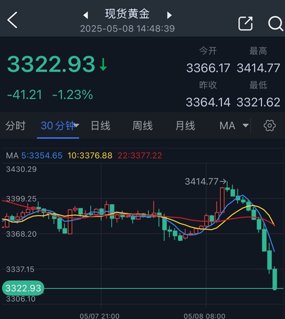 24K99讯 周四(5月8日)亚市尾盘,现货黄金突然加速下滑,金价刚刚跌至3321.62美元/盎司,较亚市盘中触及的日内高点3414.77美元/盎司暴跌逾90美元。