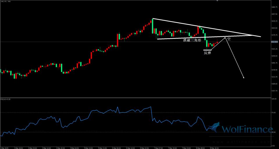 黄金跌破三角形震荡反弹,触及阻力点做空逻辑。
