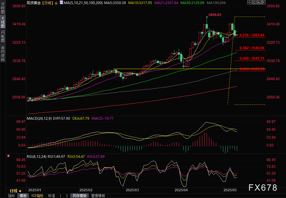 汇通财经APP讯——周五(5月9日)亚市盘初,现货黄金小幅反弹,目前交投于3319.75美元/盎司附近,受到逢低买盘的支撑。黄金周四延续跌势,下挫近2%,现货黄金盘中最低触及3288.72美元/盎司,收报3305.70美元/盎司,此前美国总统特朗普宣布与英国达成贸易协议,从而提高了与其他国家达成此类协议的希望,缓解了市场的紧张情绪,打压黄金的避险买盘,美元、美股和美债收益率上涨,也打压金价走势。
