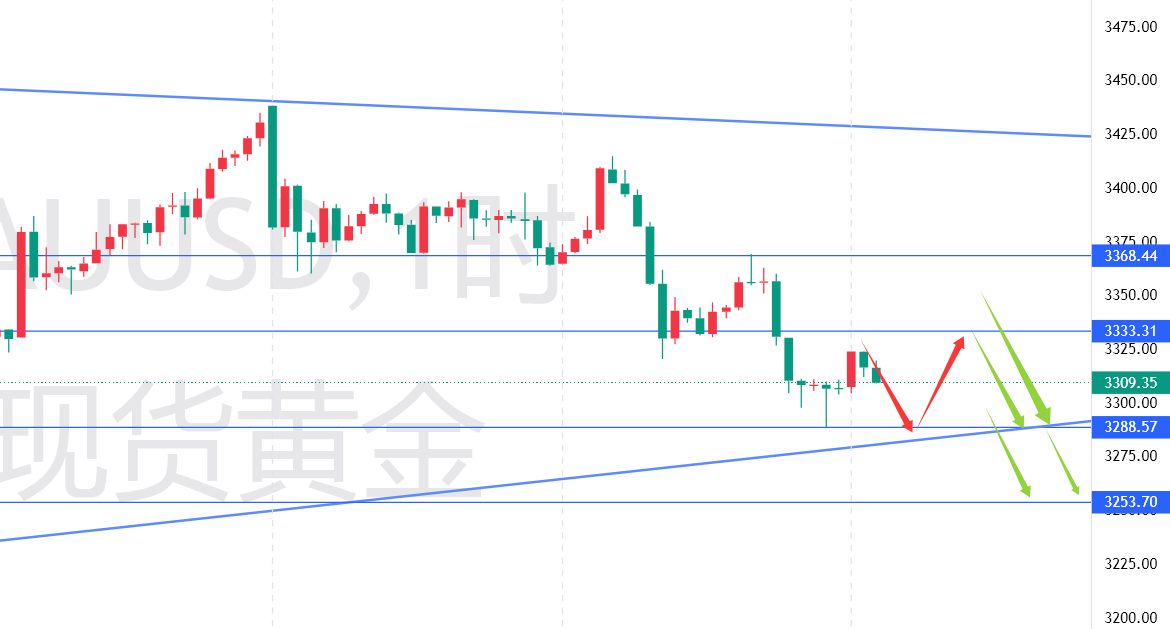 具体操作思路,早盘短线操作建议是下方以3288为保护在3295附近接短多看3330小时线压制情况;欧盘前后金价上触3330可以做空看下行,目标下看3300关口;中线思路,3330-3338分批布空看跌,第一目标看昨日3288低点位置,破位须看至3254附近;若欧盘反弹无力向下破位3288的支撑,那么反弹3295附近直接空,下方也是看3254的目标位。