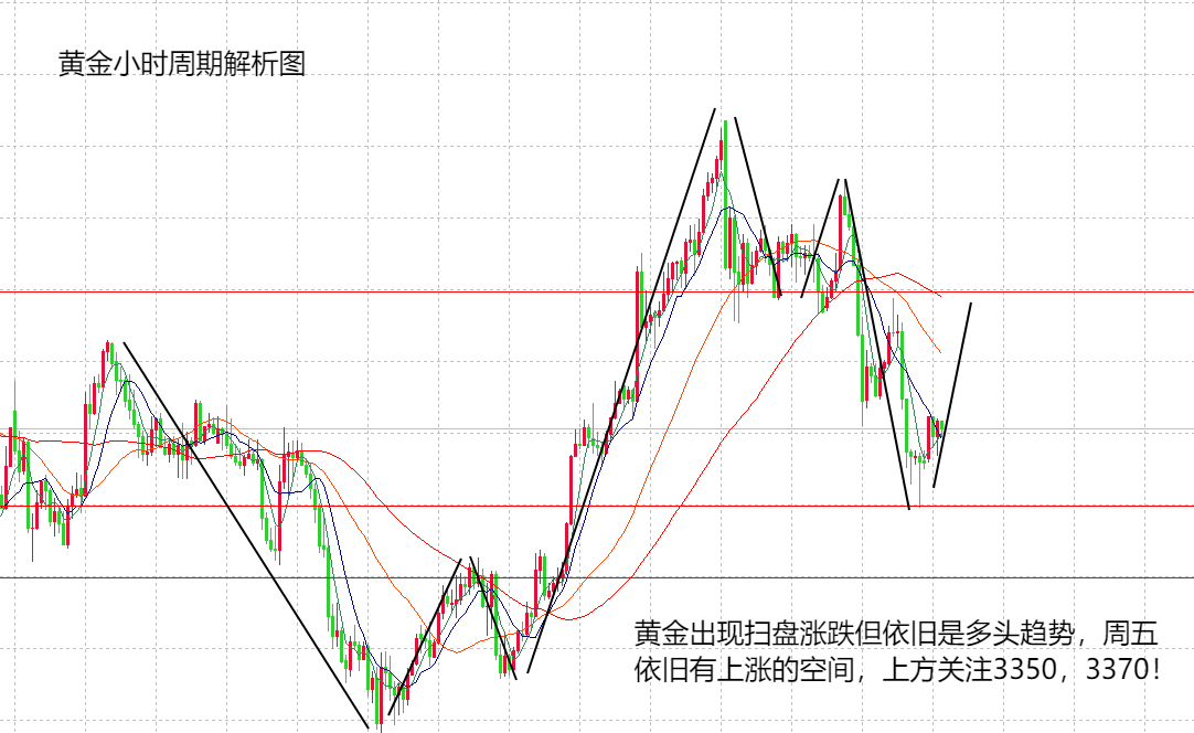 受市场消息面影响,美元指数意外走出了上涨空间,并且破位100,那么,今天就要关注美元的延续走势,如果继续上涨,上方就可以看到102,如果周五调整回落,也有机会走低,所以,美元指数不确定今天的涨跌。鉴于美元现在稍微变强,黄金午夜大跌至3288后,稍微变弱,所以,今天就不会像本周之前那么强势,今天要调整一下思路,从前面的强势,现在换成弱势,从前面继续看涨,到现在移动下行区间。那么,交易的话也要注意,今天尽量做短线交易,不要被这种反复的涨跌诱导。从技术面来看,日线已经连阴,这种情况确定变弱,后市是否有延续性还需要观察,如果成立,下方或看至3260,3200,但日线在周五如果反阳,也可以随时转强,毕竟现在价位刚好在日线布林中轨附近,涨跌均有可能性。H4周期就要注意今天的收线情况,暂时价位在3300附近,延续下跌,布林下轨拉开,可能会形成单边,出现反弹,布林收口,也会再走强势上涨,所以,暂时不太好说具体的涨跌情况,建议多观察一下,看亚欧盘是否破位3288的新低,上方压制在3350,3370。早盘黄金先涨后跌,走的比较凶猛,建议不要追单,先关注3288支撑,不破尝试做多,破位,下方就要去3260低点。预计周五黄金还有一波上涨空间。