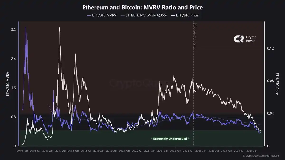 知名 Crypto Youtuber,Crypto Rover 认为现在以太坊还是在被过分低估的状态并配上了该图表,当前 ETH/BTC 的 MVRV 比与价格均处于历史低位,在过去类似阶段「图中绿色区域」常伴随 ETH 的价格反弹或相对强势周期。