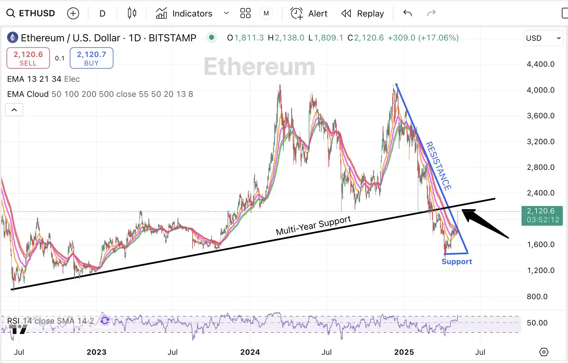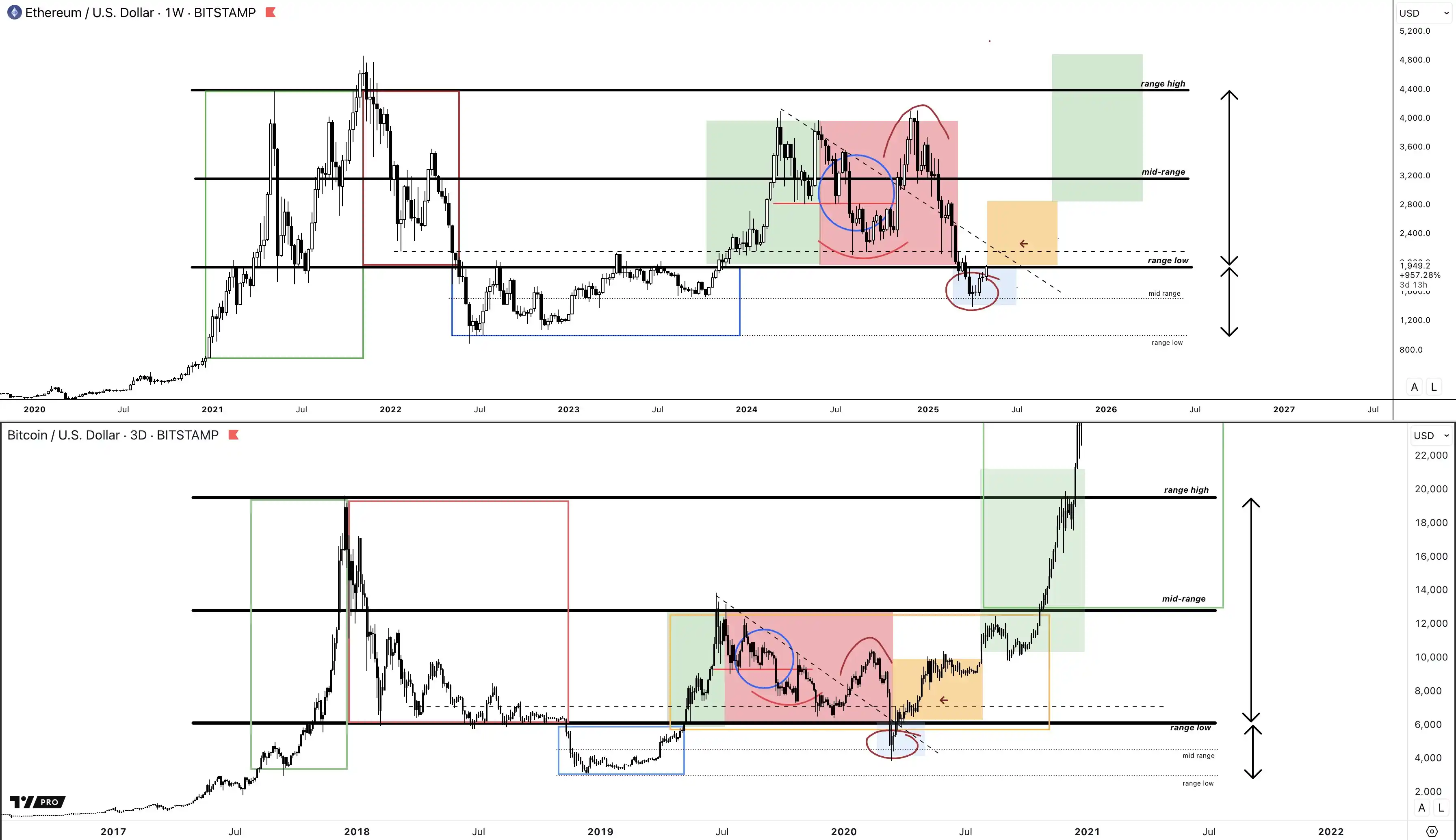知名研究员 CryptoAmsterdam 发布了一张 ETH 与 Bitcoin 类似的趋势范围图,并认为以 Bitcoin 的图表做类比,如果 ETH 能够成功站稳当前这个 2000 美元周边的「低点」,ETH 将会为市场带来 Alt Season。