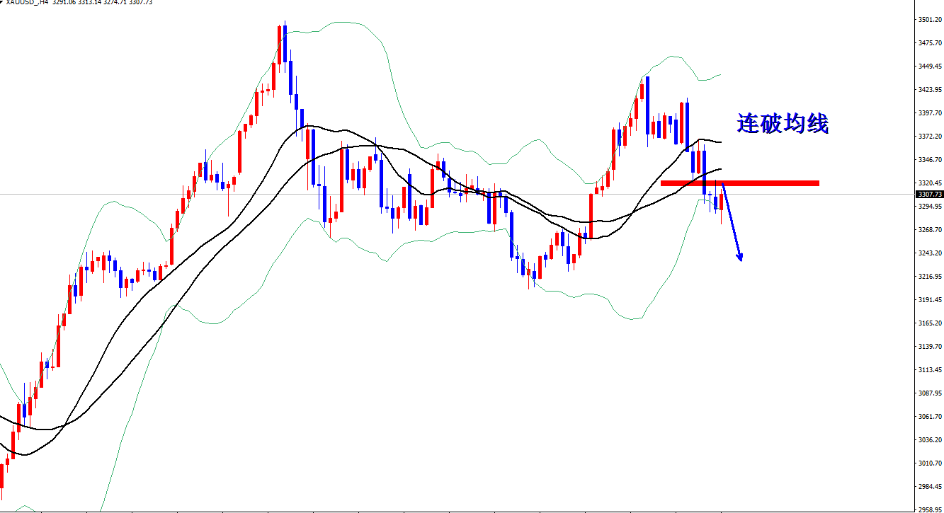 4小时周期,金价连续跌破均线,一路走低,这样的行情,怎么可能去做多呢?继续秉持高空思路,现在3320一线已经成为压力位,在其下方,我们就坚持做空。