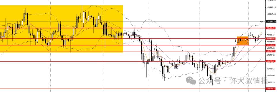 比特币一举升破100000大关,站上日线布林上轨,日线RSI到达高位,短线趋势极为强劲,多单可继续持有,如站稳102000一线,可看多至106000附近。