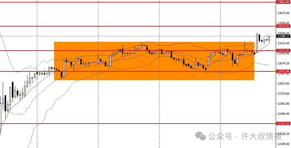 A50小幅回升,刺破日线布林上轨,日线RSI继续走高,4小时呈空中加油,13200上方可延续低多思路,短线有望进一步上探13500附近。