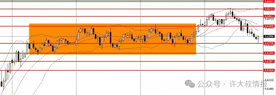 澳美收倒锤阴线,下破日线布林中轨,4小时回踩0.6370一线支撑企稳,如无法下破,短线空单可离场,如反抽至0.6440一线再度承压可进空。