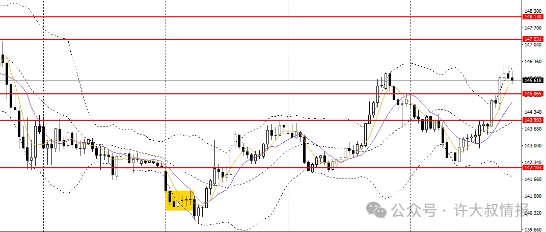 美日收长阳柱,升破近一个月新高,日线RSI站上50,4小时于146附近遇阻,呈平头顶部,如未能有效上破,多单可减仓。如回踩145.10附近企稳可进多。