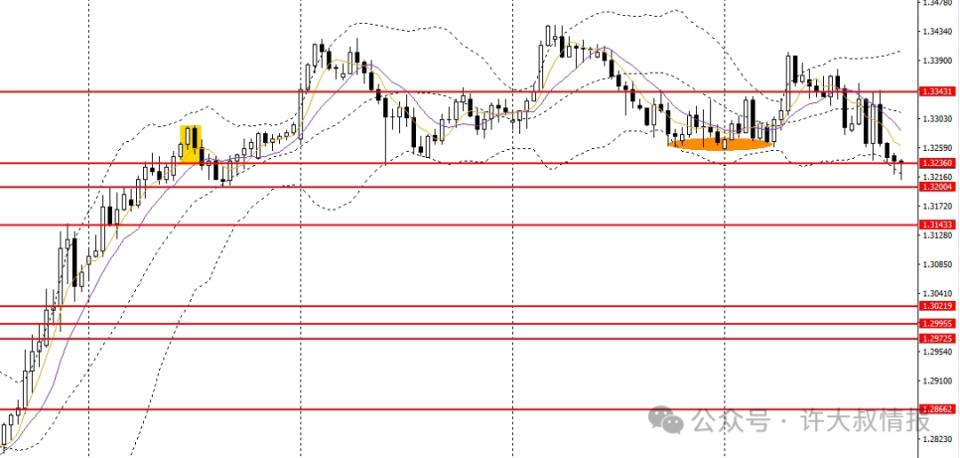 镑美收流星阴线,5日、10日均线呈空头排列,4小时一度升破1.3340一线阻力,但随后再度失守,日线呈头肩顶,1.3250如不破可维持空头思路,短线预计将回踩1.32。